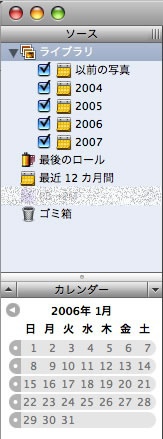 左の画像は旧iPhoto(’06)のメニューをキャプチャしたものですが、このカレンダー機能はよく使っていただけに、無くなってしまったようで残念です。過去に撮影した写真を探す時、「ええと、確か去年の10月頃だったよなぁ」って時にはとても便利だった機能。